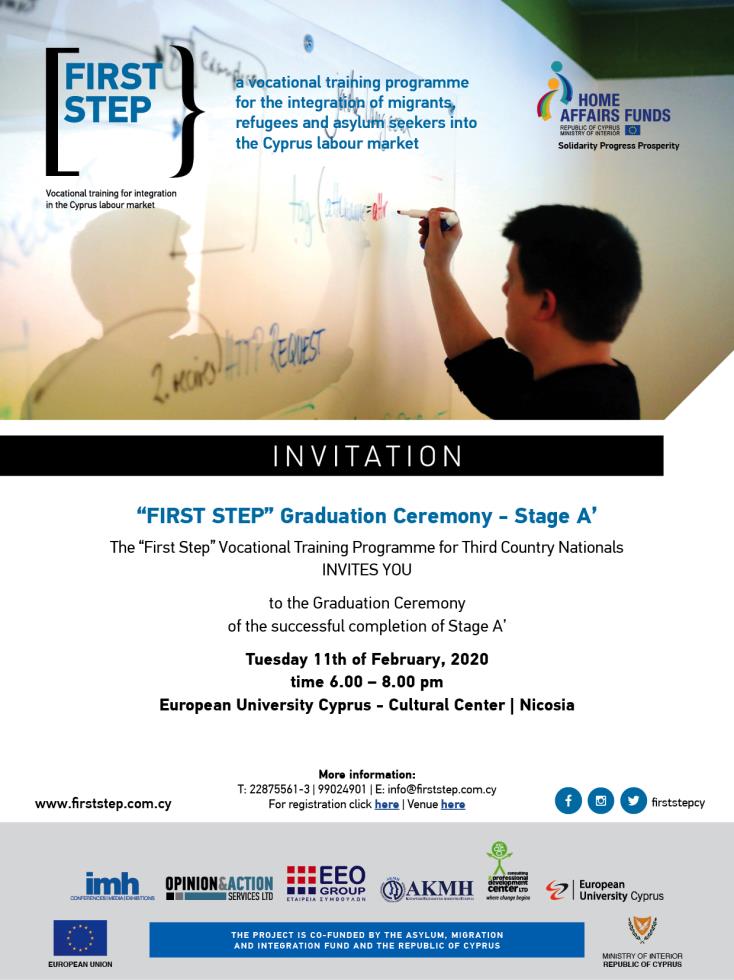 Το Α’ Στάδιο εκπαίδευσης για τους πρώτους 300 συμμετέχοντες, κυρίως πρόσφυγες και αιτητές ασύλου, του προγράμματος εκπαίδευσης και κατάρτισης “First Step” για Υπηκόους Τρίτων Χωρών έχει ολοκληρωθεί με επιτυχία. Η τελετή ολοκλήρωσης, θα πραγματοποιηθεί την Τρίτη 11 Φεβρουαρίου ώρα 6.00 – 8.00 μ.μ. στο Πολιτιστικό Κέντρο του Ευρωπαϊκού Πανεπιστημίου.
