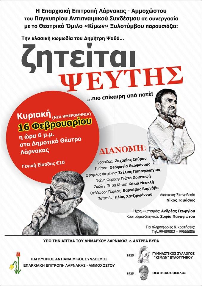 Η Επαρχιακή Επιτροπή Λάρνακας – Αμμοχώστου του Παγκύπριου Αντιαναιμικού Συνδέσμου, σε συνεργασία με το Θεατρικό Όμιλο «Κίμων» Ξυλοτύμπου, παρουσιάζουν την Κυριακή 16 Φεβρουάριου 2020 στις 6 μ.μ. στο Δημοτικό Θέατρο Λάρνακας, την κλασσική κωμωδία του Δημήτρη Ψαθά «Ζητείται Ψεύτης».