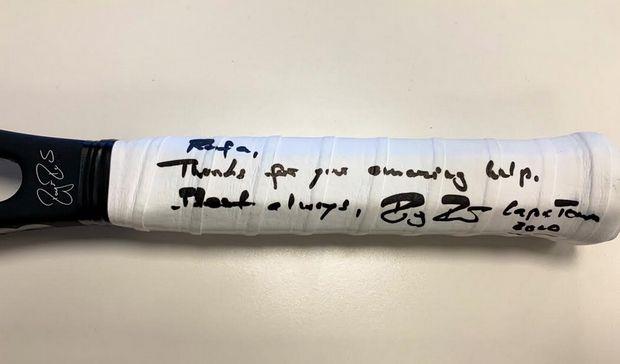 Η αφιέρωση του Φέντερερ στη λαβή της ρακέτας, έγραφε: "Rafa, Thanks for your amazing help. Best always. Roger Federer, Cape Town 2020"