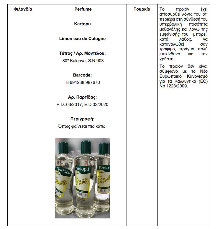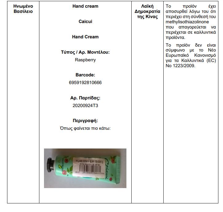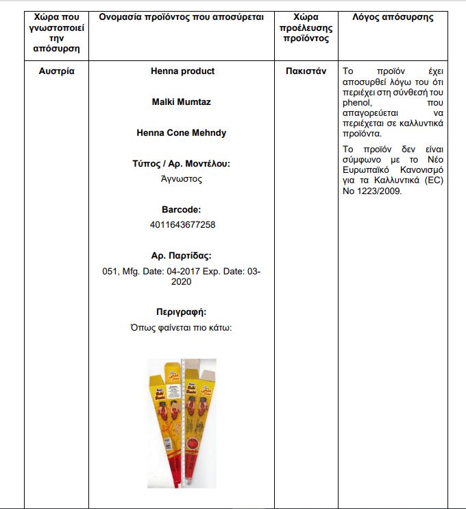 Το Δίκτυο Ταχείας Ανταλλαγής Πληροφοριών (RAPEX), στην τελευταία γνωστοποίησή του, ενημερώνει τα κράτη μέλη ότι στην Ευρώπη έχουν εντοπισθεί και αποσυρθεί καλλυντικά προϊόντα.