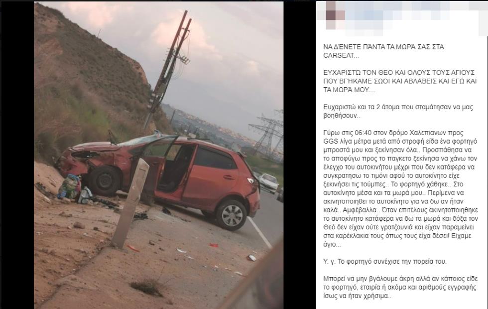 «Να δένετε πάντα τα μωρά σας στα carseat... Ευχαριστώ τον Θεό και όλους τους Αγίους που βγήκαμε σώοι και αβλαβείς και εγώ και τα μωρά μου… Ευχαριστώ και τα 2 άτομα που σταμάτησαν να μας βοηθήσουν..