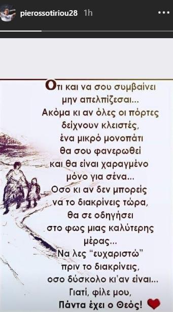 «Ότι και να σου συμβαίνει μην απελπίζεσαι…. Ακόμα κι αν όλες οι πόρτες δείχνουν κλειστές, ένα μικρό μονοπάτι θα σου φανερωθεί και θα είναι χαραγμένο μόνο για σένα… Όσο κι αν μπορείς να το διακρίνεις τώρα, θα σε οδηγήσει στο φως μιας καλύτερης μέρας. Να λες ‘ευχαριστώ’ πριν το διακρίνεις, όσο δύσκολο κι αν είναι… Γιατί φίλε μου, Πάντα έχει ο Θεός».