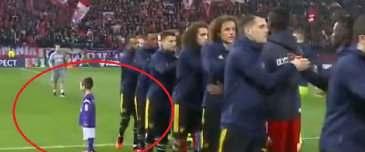 Ο πιτσιρίκος ξέχασε να τρέξει έξω από την αγωνιστικό χώρο όπως το έκαναν τα υπόλοιπα παιδιά που συνόδευσαν τους παίκτες των Ολυμπιακού και Άρσεναλ, έδειχνε... χαμένος, αλλά οι Λονδρέζοι του χάρισαν τη μαγική στιγμή και μια φωτογραφία που θα κρατήσει για μια ζωή.