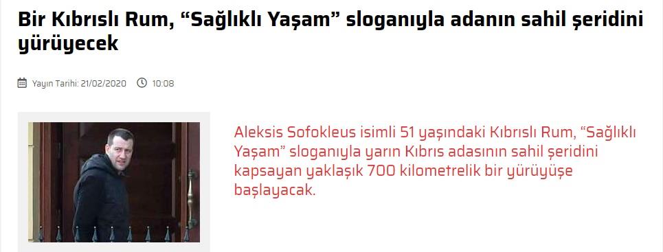 Σύμφωνα με το δημοσίευμα ένας άνδρας εν ονόματι Αλέξης Σοφοκλέους, θα περπατήσει περίπου 700 χιλιόμετρα κατά μήκος της ακτογραμμής της Κύπρου για να στείλει το μήνυμα για υγιή ζωή, πραγματοποιώντας το όνειρο του.