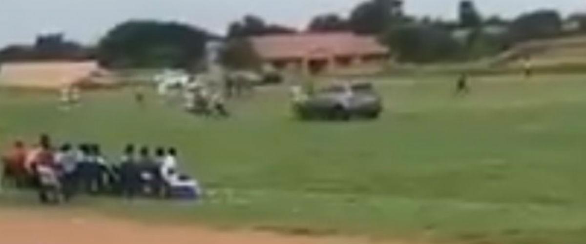 Όπως θα δείτε στο παρακάτω βίντεο, τη στιγμή που βρίσκεται σε πλήρη εξέλιξη το παιχνίδι, ένα τζιπ μπαίνει στον αγωνιστικό χώρο κι αρχίζει ν' αναπτύσσει ταχύτητα για να φτάσει στην απέναντι περιοχή όπου εξελίσσεται το ματς...