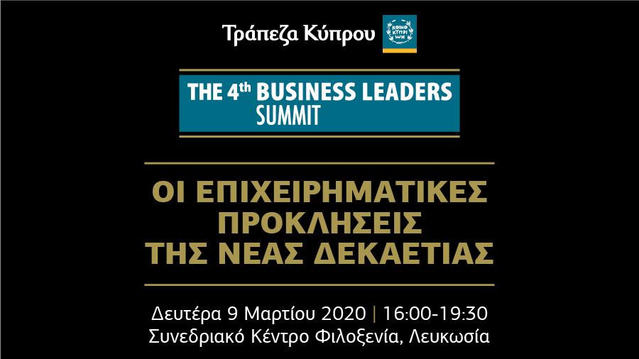 Η Τράπεζα Κύπρου διοργανώνει για τέταρτη συνεχή χρονιά το πολυαναμενόμενο επιχειρηματικό γεγονός «The 4th Business Leaders Summit», την Δευτέρα 9 Mαρτίου 2020, 16:00-19:30 μ.μ., στο Συνεδριακό Κέντρο Φιλοξενία στη Λευκωσία.