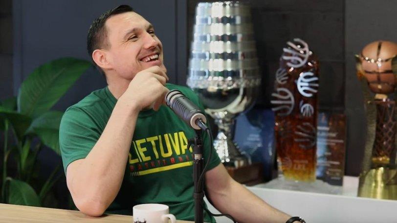Με το χαμόγελο στα χείλη, ο έμπειρος Λιθουανός φόργουορντ της ΑΕΚ άρχισε να λέει τις «κακές» λέξεις που γνωρίζει στα ελληνικά ξεχωρίζοντας το «μαλ....α» και το «άντε γα.....ου»