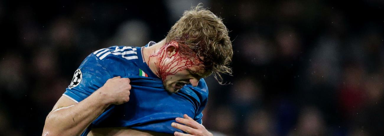 Άσχημο χτύπημα για τον Ματάις Ντε Λιχτ στο κεφάλι, με τον αμυντικό της Γιούβε να είναι γεμάτος αίματα και να συνεχίζει με επίδεσμο.