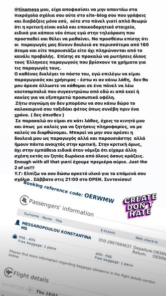 «Τίνα Mεσσαροπούλου μου, είχα αποφασίσει να μην απαντάω στα πικρόχολα σχόλια σου ούτε στο site-blog σου που γράφεις και διαβάζεις μόνο εσύ, ούτε στο πάνελ γιατί απλά θεωρώ ότι η κριτική είναι καλό και εποικοδομητικό στοιχείο, ειδικά για κάποιο νέο όπως εγώ στην τηλεόραση που προσπαθεί και θέλει να μαθαίνει. Να προσθέσω επίσης ότι οι παραγωγές μας δίνουν δουλειά σε περισσότερα από 160 άτομα και είτε παρουσιάζω είτε όχι πληρώνονται από το κανάλι προβολής. Επίσης σε προκαλώ να ρωτήσεις όλους τους Έλληνεες παραγωγούς που βρίσκουν τα χρήματα για τις παραγωγές τους. Ο καθένας διαλέγει το πόστο του, εγώ επιλέγω να είμαι παραγωγικός και χρήσιμος – έστω κι αν κάνω λάθη, δεν θα μου άρεσε άλλωστε να κάθομαι σε ένα πάνελ να λέω κουτσομπολιά που συγκεντρώνω από εδώ κι από εκεί ή κακίες για να εξυπηρετώ προσωπικά οφέλη. Ζήτω συγνώμη αν δεν μπορέσω να σου κάνω δώρο το καλοκαιρινό σου ταξιδάκι φέτος όπως συνέβη πριν ένα χρόνο. Σε παρακαλώ αν είμαι σε κάτι λάθος, έχεις το κινητό μου και όπως με καλείς για να ζητήσεις πληροφορίες, να με καλείς να διορθώνομαι. Μπορεί να μην σου αρέσει η δουλειά μου ως παραγωγός αλλά και παρουσιάστης αλλά ήμουν πάντα ανοιχτός στην κριτική. Στην κριτική όμως, όχι στην εμπάθεια ειδικά όταν νόμιζα ότι είχαμε άλλη σχέση εκτός αν ζητάς δωράκια από όλους όσους κράζεις. Enough with all that γιατί έχουμε πρεμιέρα αύριο. Just the 2 of us!!! Υ.Γ: Ελπίζω να οου δώσω αρκετό υλικό για τα επόμενά σου σχόλια . Σάββατο στις 21:00 στο OPEN. Συντονίσου!»