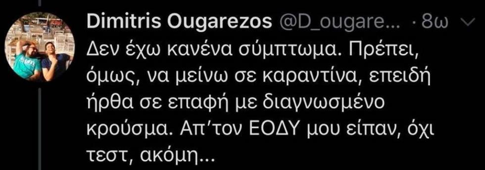 Ο Δημήτρης Ουγγαρέζος με τη σειρά του αποκάλυψε στο Twitter: «Δεν έχω κανένα σύμπτωμα, πρέπει όμως να μείνω σε καραντίνα, επειδή ήρθα σε επαφή με διαγνωσμένο κρούσμα. Από τον ΕΟΔΥ μου είπαν όχι τεστ ακόμη».