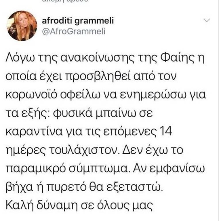 Η Αφροδίτη Γραμμέλη επεσήμανε πως δεν έχει κανένα σύμπτωμα, όμως θα παραμείνει στο σπίτι ώστε να προστατεύσει την ίδια, τους δικούς της ανθρώπους και γενικότερα τους υπόλοιπους συνανθρώπους της.