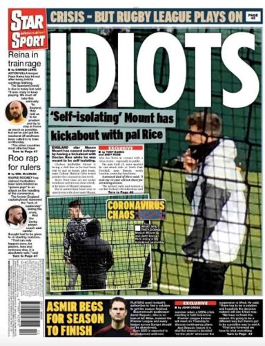 Η Daily Star κυκλοφόρησε έχοντας στο πρωτοσέλιδό της φωτογραφίες με τους Μάουντ και Ράις σε γηπεδάκι το οποίο επισκέφθηκαν την Κυριακή με φίλους τους για να παίξουν μπάλα, αδιαφορώντας πλήρως για την ανάγκη να παραμείνουν στο σπίτι τους ώστε να βοηθήσουν στη μη εξάπλωση του κορωνοϊού...