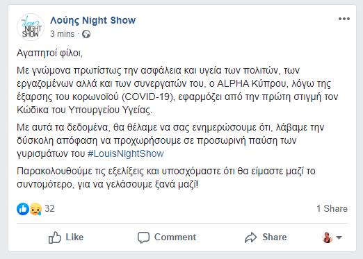 Με αυτά τα δεδομένα, θα θέλαμε να σας ενημερώσουμε ότι, λάβαμε την δύσκολη απόφαση να προχωρήσουμε σε προσωρινή παύση των γυρισμάτων του #LouisNightShow