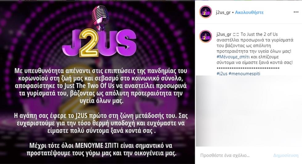 «Με υπευθυνότητα απέναντι στις επιπτώσεις της πανδημίας του κορωνοϊού στη ζωή μας και σεβασμό στο κοινωνικό σύνολο, αποφασίστηκε το Just the 2 of us να αναστείλει προσωρινά τα γυρίσματά του, βάζοντας ως απόλυτη προτεραιότητα την υγεία όλων μας.