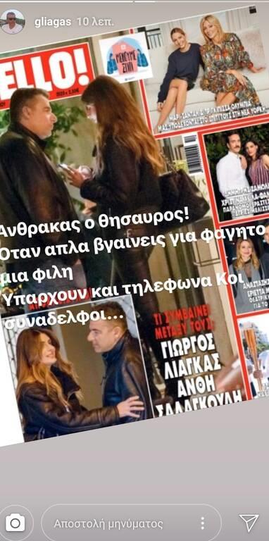 Ο Γιώργος Λιάγκας δημοσίευσε μία φωτογραφία που απεικονίζει το εξώφυλλο του περιοδικού και έγραψε: «Άνθρακας ο θησαυρός. Όταν απλά βγαίνεις για φαγητό με μια φίλη. Υπάρχουν και τηλέφωνα κύριοι συνάδελφοι»!