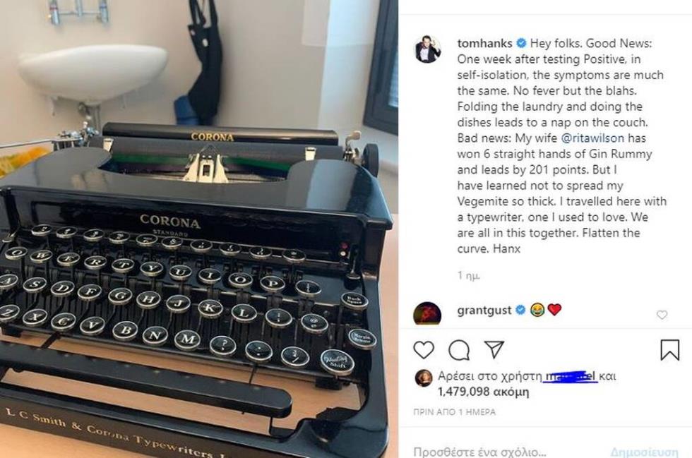 «Γειά σας φίλοι μου! Καλά νέα: Μια εβδομάδα μετά το τεστ που έδειξε ότι είμαστε θετικοί στον κορωνοϊό και την αυτο- απομόνωση τα συμπτώματα είναι σχεδόν ίδια. Δεν έχω πυρετό αλλά θλίψη… Απλώνοντας τα ρούχα και πλένοντας τα πιάτα μετά πρέπει να ρίξω ένα υπνάκο στον καναπέ. Τα κακά νέα: Η γυναίκα μου Ρίτα Γουίλσον με έχει κερδίσει στο Gim Rummy πάνω από 6 φορές και προηγείται 201 πόντους. Ταξίδεψα εδώ με μια γραφομηχανή που κάποτε αγαπούσα (λέγεται corona). Eίμαστε μαζί σε όλο αυτό. Μειώστε τα ποσοστά του ιού με τον τρόπο σας».