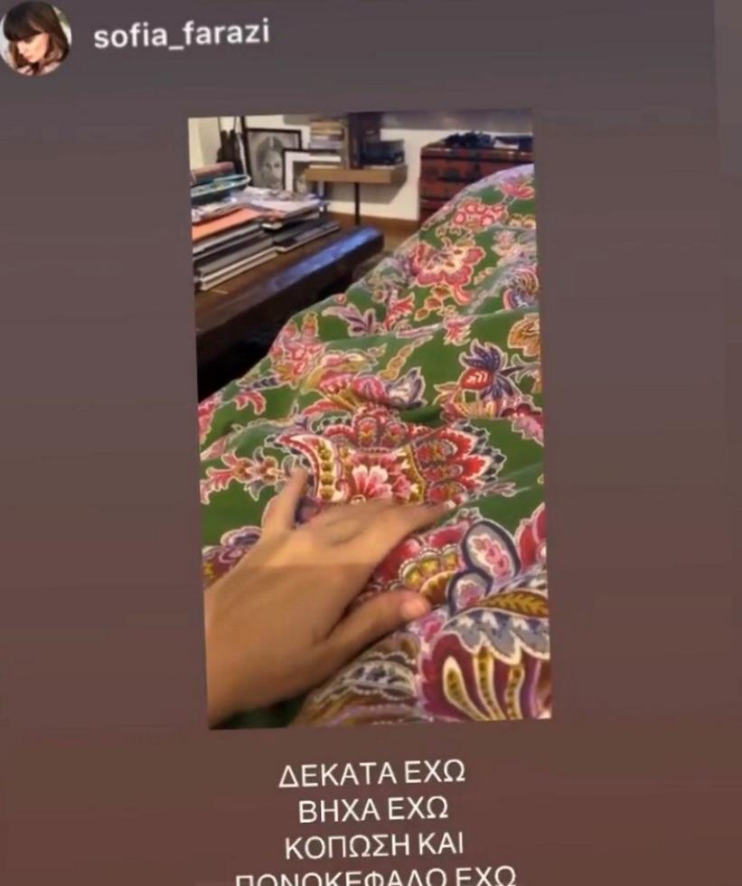«Δέκατα έχω, βήχα έχω, κόπωση και πονοκέφαλο έχω» , έγραψε στην πρώτη φωτογραφία που δημοσίευσε.