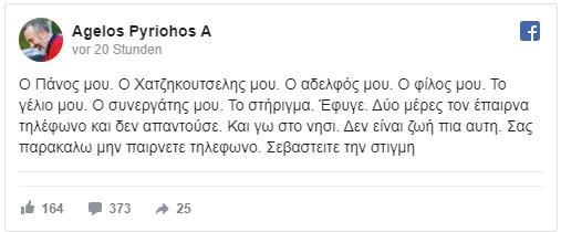 “Ο Πάνος μου. Ο Χατζηκουτσελης μου. Ο αδελφός μου. Ο φίλος μου. Το γέλιο μου. Ο συνεργάτης μου. Το στήριγμα. Έφυγε. Δύο μέρες το έπαιρνα τηλέφωνο και δεν απαντούσε. Και εγώ στο νησί. Δεν είναι ζωή πια αυτή”, έγραψε και τα λόγια του ραγίζουν καρδιές.