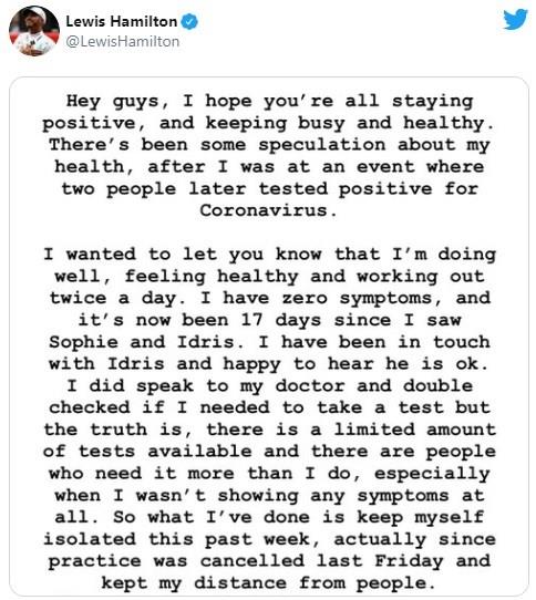 «Γεια σας, ελπίζω να μείνετε όλοι υγιείς και με απασχόληση. Υπήρξαν φήμες, επειδή συνάντησα πριν 17 ημέρες δύο άτομα (από τον χώρο των ηθοποιών του κινηματογράφου), που διαγνώστηκαν αργότερα θετικά στον ιό. Είμαι καλά, όπως επίσης και αυτοί οι δύο άνθρωποι. Ο γιατρός μου είπε, ότι δεν χρειάζομαι κάποιο τεστ. Δυστυχώς όμως είναι αλήθεια, ότι υπάρχουν πολύ λίγα τεστ εδώ. Και αυτά τα χρειάζονται ορισμένοι άνθρωποι περισσότερο από εμένα, γιατί σε εμένα δεν εμφανίστηκαν κάποια συμπτώματα. Πλένω συνεχώς τα χέρια μου και παραμένω απομονωμένος από την προηγούμενη Παρασκευή που αναβλήθηκαν τα δοκιμαστικά», έγραψε ο Λιούις Χάμιλτον.