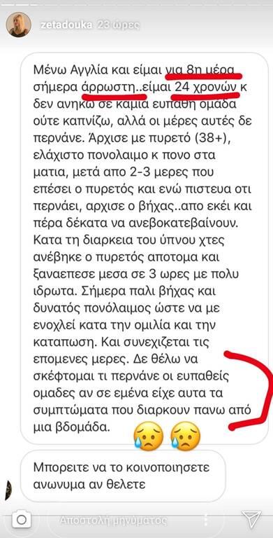 Η Ζέτα Δούκα μοιράστηκε με τους followers της ένα μήνυμα που έλαβε από 24χρονη «χτυπημένη» από κορωνοϊό.