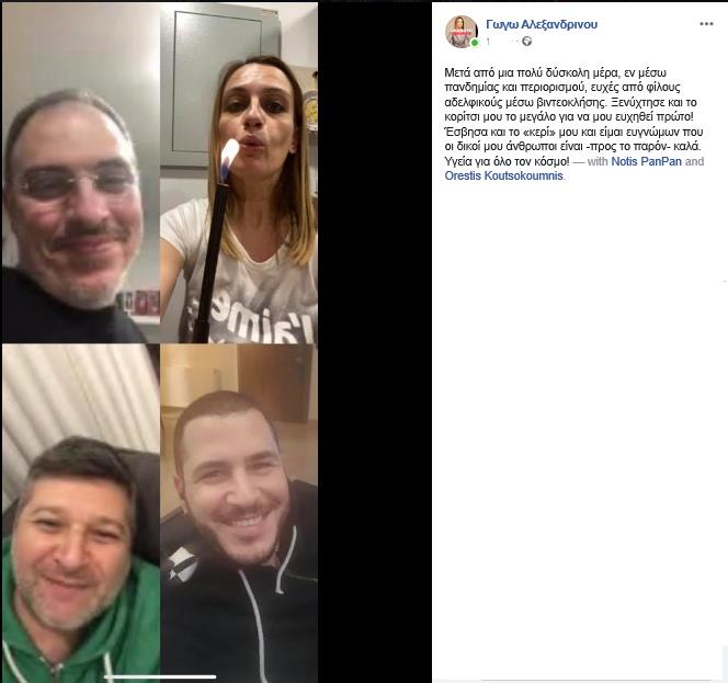 “Μετά από μια πολύ δύσκολη μέρα, εν μέσω πανδημίας και περιορισμού, ευχές από φίλους αδελφικούς μέσω βιντεοκλήσης. Ξενύχτησε και το κορίτσι μου το μεγάλο για να μου ευχηθεί πρώτο! Έσβησα και το «κερί» μου και είμαι ευγνώμων που οι δικοί μου άνθρωποι είναι -προς το παρόν- καλά. Υγεία για όλο τον κόσμο!”, έγραψε στη υ ανάρτηση της.