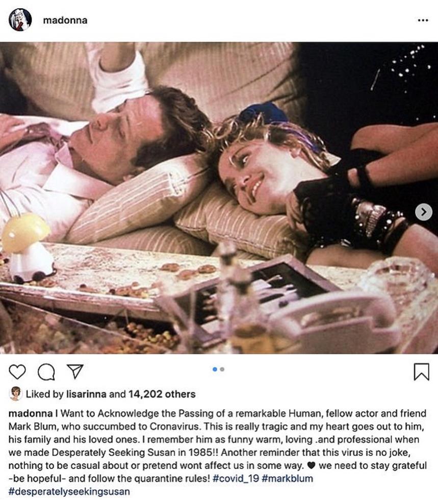 Μάλιστα, το 1985 είχε πρωταγωνιστήσει στη σειρά Desperately Seeking Susan, στην οποία συμμετείχε και η Madonna! Η βασίλισσα της ποπ αποχαιρέτησε τον αγαπημένο της συνάδερφο, με ένα δυνατό μήνυμα στο Instagram, συστήνοντας σε όλους την προσοχή πως ο κορωνοϊός δεν είναι αστείος και πως πρέπει όλοι να ακολουθήσουμε τις συμβουλές για να μείνουμε ασφαλείς.