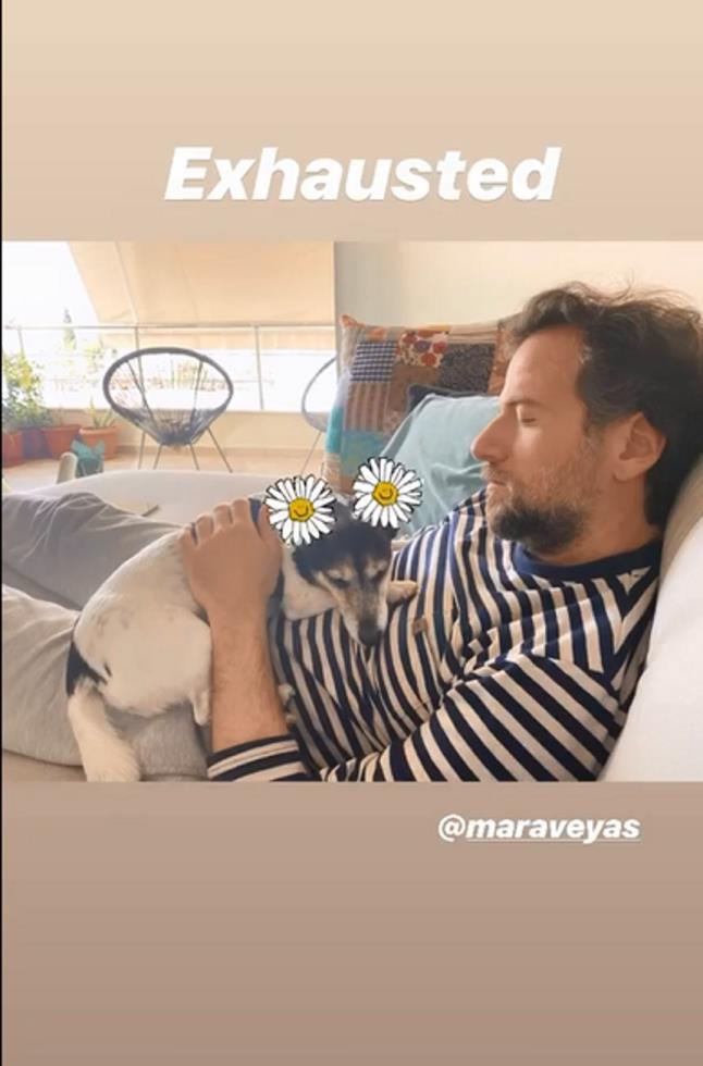 Σε μία από τις αναρτήσεις της βλέπουμε την Τόνια Σωτηροπούλου να αναλαμβάνει χρέη φωτογράφου και να απαθανατίζει τον Κωστή Μαραβέγια μαζί με τον σκύλο τους στο σαλόνι του σπιτιού τους.