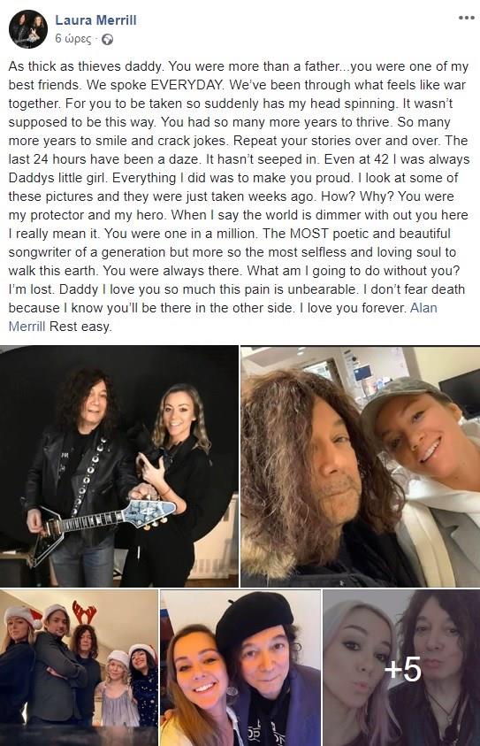 Την είδηση του θανάτου του Άλαν Μέριλ έκανε γνωστή η κόρη του, Λόρα Μέριλ, με μια ανάρτηση της μέσα από τον προσωπικό της λογαριασμό στο Facebook.