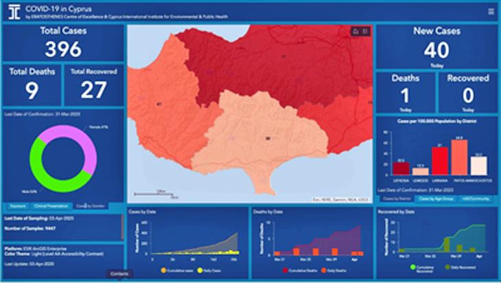 Σύμφωνα με σχετική ανακοίνωση, το Κέντρο Αριστείας ‘ΕΡΑΤΟΣΘΕΝΗΣ’ και το έργο ‘EXCELSIOR’ H2020 Teaming (https://excelsior2020.eu/) του Τμήματος Πολιτικών Μηχανικών και Μηχανικών Γεωπληροφορικής (ΠΟΜΗΓΕ) της Σχολής Μηχανικής του Τεχνολογικού Πανεπιστημίου Κύπρου, έχει ήδη θέσει σε λειτουργία από την 4/4/2020 σε δοκιμαστική φάση εξειδικευμένη πλατφόρμα WebGIS για την παρακολούθηση των κρουσμάτων του COVID19 στην Κύπρο.