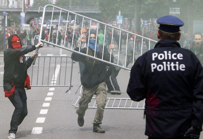 Οι διαδηλωτές --περίπου 60.000 άνθρωποι σύμφωνα με την αστυνομία-- είχαν αρχίσει να διαλύονται κοντά στο Γκαρ ντι Μιντί των Βρυξελλών όταν ταραξίες εκτόξευσαν διάφορα αντικείμενα εναντίον των αστυνομικών που απάντησαν με νερό υπό πίεση. Ορισμένοι από τους ταραξίες είχαν καλύψει τα πρόσωπά τους με μαντίλια ή με αντιασφυξιογόνες μάσκες.