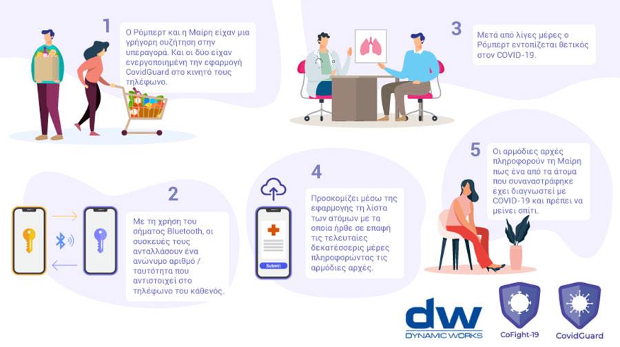 Η εταιρία DW DYNAMIC WORKS LTD, η οποία ανέπτυξε το βραβευμένο Σύστημα Διαχείρισης Πελατών (CRM) Syntellicore, όπως και εκατοντάδες άλλες εφαρμογές και ιστοχώρους, ανακοινώνει  σήμερα την κυκλοφορία του CovidGuard. Το CovidGuard είναι μία εφαρμογή  για κινητά που ανιχνεύει τα άτομα με τα οποία ήρθε κάποιος σε επαφή τις τελευταίες δεκατέσσερις μέρες. Η εφαρμογή βασίζεται στη χρήση Bluetooth.