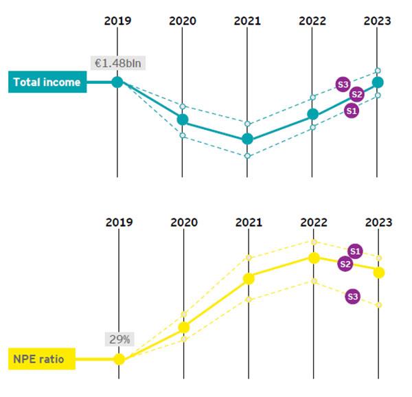 Σε ό,τι αφορά τα έσοδα από τόκους δεν εκτιμάται ότι θα επηρεαστούν ουσιαστικά το 2020 παρά το μορατόριουμ καταβολής δόσεων. Τα χαμηλά βασικά επιτόκια που καθορίζονται σε ευρωπαϊκό επίπεδο καθώς και τα χαμηλά περιθώρια που οφείλονται στην πιθανή εφαρμογή του κρατικού σχεδίου εγγυήσεων αναμένεται να επηρεάσουν τα έσοδα από τόκους. Ωστόσο, τα έσοδα από τέλη και προμήθειες θα επηρεαστούν το 2020 λόγω της χαμηλής οικονομικής δραστηριότητας. Το 2021, τα έσοδα από τόκους είναι πιθανό να επηρεαστούν λόγω νέου κύματος μη εξυπηρετούμενων χορηγήσεων.