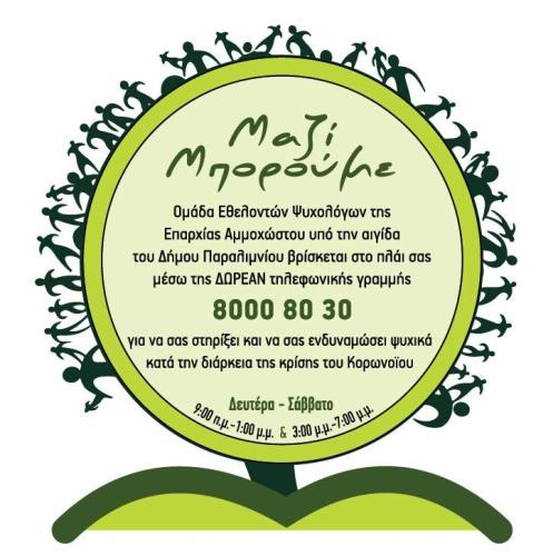 Για το σκοπό αυτό έχει δημιουργηθεί ΔΩΡΕΑΝ τηλεφωνική γραμμή επικοινωνίας με τον αριθμό 8000 80 30 και λειτουργεί από Δευτέρα – Σάββατο από τις 9π.μ. μέχρι τις 1μ.μ. και από τις 3μ.μ. μέχρι και τις 7μ.μ.