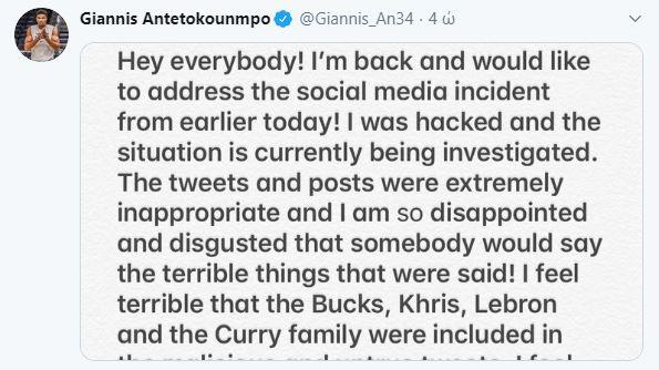 «Γεια σας. Είμαι και πάλι εδώ και θα ήθελα να σας ενημερώσω για το περιστατικό με τους λογαριασμούς μου στα social media. Με χάκαραν και η υπόθεση είναι υπό έρευνα αυτή τη στιγμή. Τα tweets και τα post ήταν υπερβολικά απαράδεκτα και είμαι πολύ απογοητευμένος και αηδιασμένος που κάποιος έγραψε αυτά τα απαίσια πράγματα. Νοιώθω απαίσια που οι Μπακς, ο Κρις (Μίντλετον), ο Λεμπρόν (Τζέιμς) και η οικογένεια Κάρι συμπεριλαμβάνονται σε αυτά τα κακεντρεχή και αναληθή tweets. Νοιώθω ιδιαίτερα απαίσια για την οικογένεια Μπράιαντ που σε μια περίοδο που πενθεί δεν θα έπρεπε να γίνουν αντικείμενο αρνητικότητας και απαράδεκτης συμπεριφοράς. Ευχαριστώ που υποστηρίζεται εμένα και την οικογένειά μου και μείνετε ασφαλείς» έγραψε ο Γιάννης Αντετοκούνμπο.
