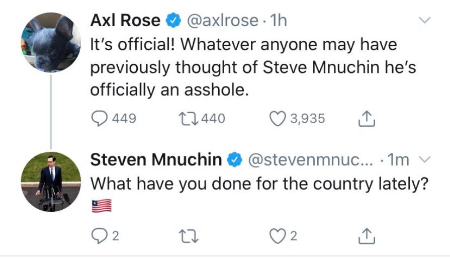 Ο Axl Rose, ο τραγουδιστής του θρυλικού ροκ συγκροτήματος της δεκαετίας του 1980 Guns N ’Roses, διαφώνησε ανοικτά στο Twitter με τον υπουργό Οικονομικών των ΗΠΑ, Steven Mnuchin στο Twitter για την πανδημία του κορωνοϊού, με αποτέλεσμα η κατάσταση νε ξεφύγει....