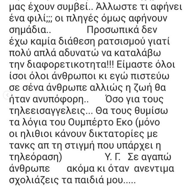 «Να κάνεις αυτά που νομίζεις πως είναι σωστά έστω κι αν πρόκειται να σε κακολογήσουν. Ο όχλος είναι κακός κριτής κάθε καλού πράγματος… (Πυθαγόρας). Όποιος δεν μπορεί να διακρίνει την ειρωνική μου διάθεση ως προς την χαζό εφαρμογή που σου λέει πόσο γκέι είσαι!!!!!!!!!! Τότε πρέπει να διερωτηθεί κατά πόσο έχει γίνει και ο ίδιος θύτης.. Ίδιος με αυτούς που τον πλήγωσαν και κατακερμάτισαν την ψυχούλα του.. Δυστυχώς έχουμε την τάση να θυμόμαστε τα άσχημα που μας έχουν συμβεί.. Άλλωστε τι αφήνει ένα φιλί;;; οι πληγές όμως αφήνουν σημάδια.. Προσωπικά δεν έχω καμία διάθεση ρατσισμού γιατί πολύ απλά αδυνατώ να καταλάβω την διαφορετικότητα!!! Είμαστε όλοι ίσοι όλοι άνθρωποι κι εγώ πιστεύω σε σένα άνθρωπε αλλιώς η ζωή θα ήταν ανυπόφορη.. Όσο για τους τηλεεισαγγελεις… Θα τους θυμίσω τα λόγια του Ουμπέρτο Εκο (μόνο οι ηλίθιοι κάνουν δικτατορίες με τανκς απ τη στιγμή που υπάρχει η τηλεόραση) Υ. Γ. Σε αγαπώ άνθρωπε ακόμα κι όταν ανέντιμα σχολιάζεις τα παιδιά μου…» έγραψε χαρακτηριστικά ο ηθοποιός ενώ στη λεζάντα πρόσθεσε: «Προσπάθησα να είμαι σύντομος.. Κάντε ένα κόπο να το διαβάσετε...».