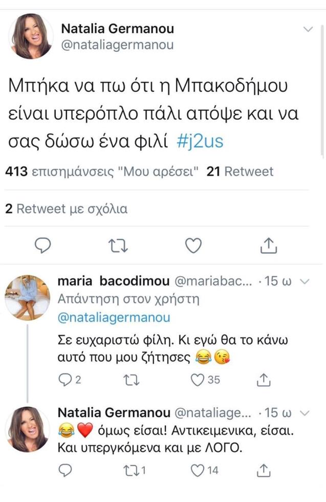 «Μπήκα να πω ότι η Μπακοδήμου είναι υπερόπλο πάλι απόψε και να σας δώσω ένα φιλί», έγραψε η Ναταλία Γερμανού, με την Μαρία Μπακοδήμου να απαντάει: «Σε ευχαριστώ φίλη. Κι εγώ θα το κάνω αυτό που μου ζήτησες».