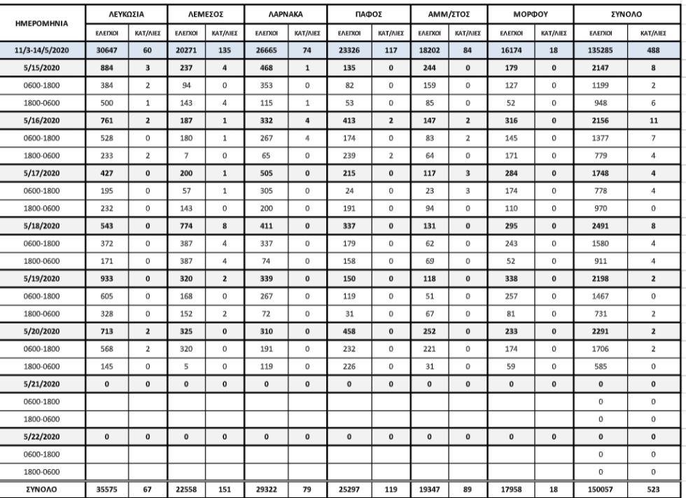 Συγκεκριμένα στη Λεμεσό διενεργήθηκαν 175669 έλεγχοι σε υποστατικά και πολίτες εκ των οποίων προέκυψαν 3308 καταγγελίες. Στη Λευκωσία εκδόθηκαν συνολικά 2728 εξώδικα, στην Αμμόχωστο 1708, στη Λάρνακα 1683, στην Πάφο 1578 και στην περιφέρεια της Μόρφου 171. Η τροχαία Αρχηγείου πραγματοποίησε συνολικά 43988 ελέγχους και εξέδωσε 520 εξώδικα.