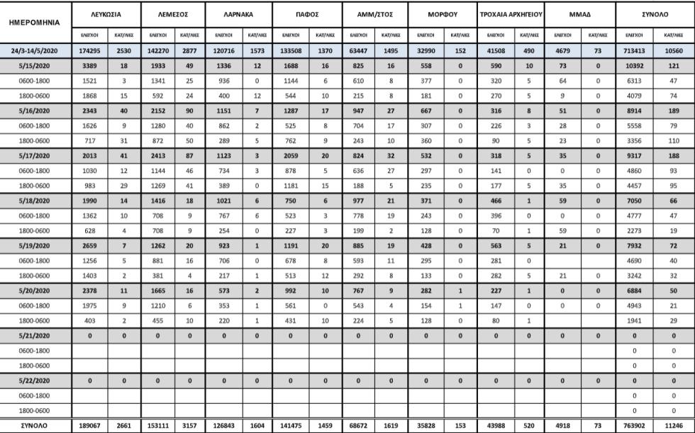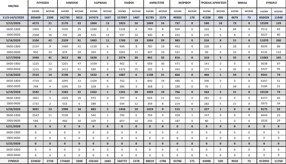 Σύμφωνα με τα στοιχεία από τις 11 Μαρτίου μέχρι σήμερα το πρωί, πραγματοποιήθηκαν συνολικά 919959 έλεγχοι εκ των οποίων προέκυψαν 11769 καταγγελίες.