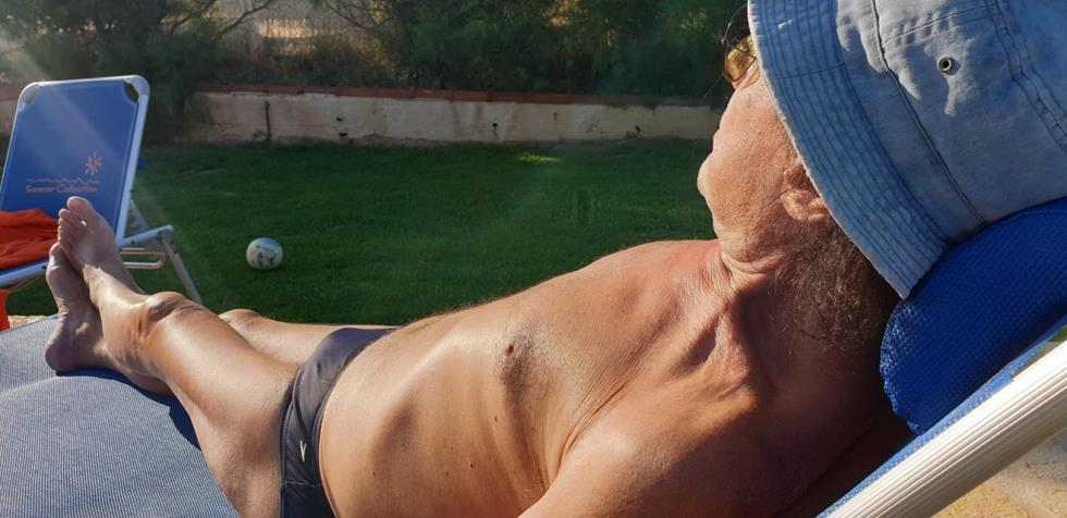 Ο λόγος; Στο εν λόγω στιγμιότυπο απεικονίζεται φορώντας μόνο το μαγιό του, την ώρα που απολαμβάνει την ηλιοθεραπεία του στον κήπο του σπιτιού του.