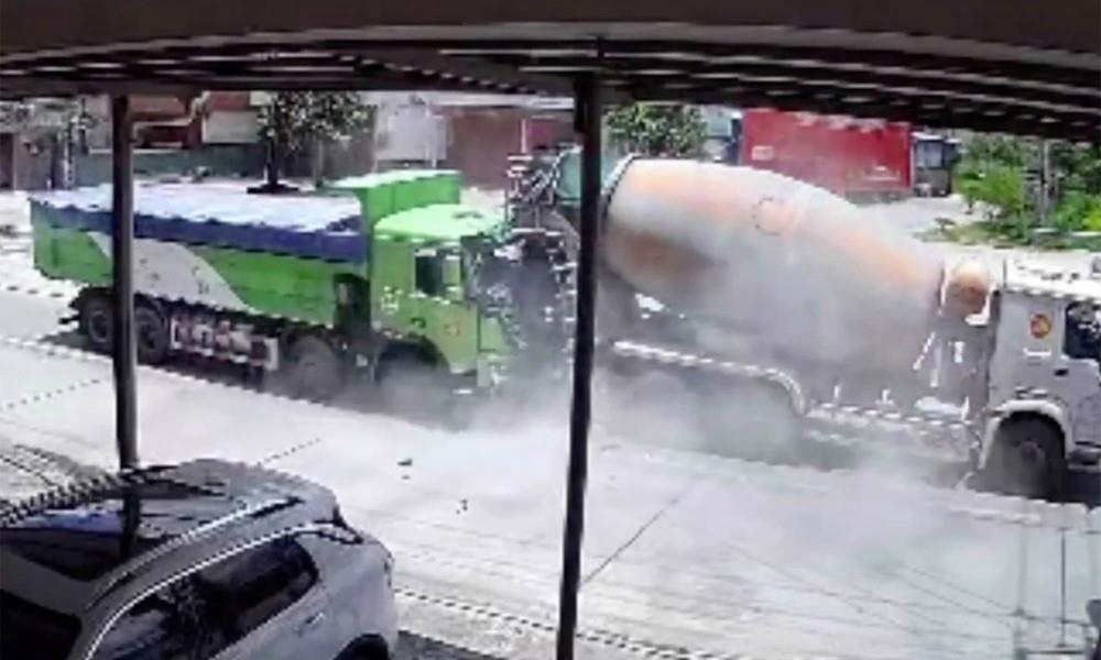 Ένα απίστευτο βίντεο από την Κίνα δείχνει δύο επιβάτες να βγαίνουν ζωντανοί από το αυτοκίνητό τους, που το έλιωσε πάνω σε μια μπετονιέρα ένα άλλο φορτηγό.