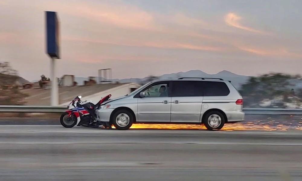 Σε ένα μάλλον παράξενο περιστατικό, την περασμένη εβδομάδα ο οδηγός ενός πολυμορφικού, εθεάθη σε κομμάτι κάποιας εθνικής οδού στην Καλιφόρνια των ΗΠΑ να οδηγεί με ταχύτητα και με μια μοτοσικλέτα σφηνωμένη στο μπροστινό μέρος.
