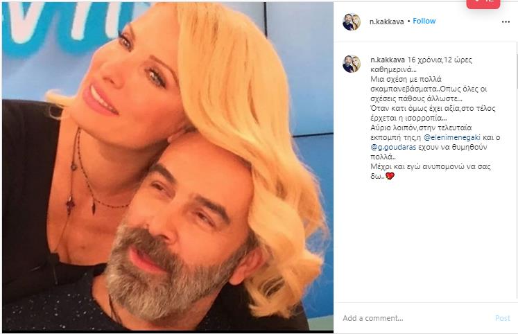 Η σύζυγός του Ναταλί Κάκκαβα αποκάλυψε πως ο Γρηγόρης Γκουντάρας θα βρεθεί και εκείνος στην τελευταία εκπομπή της Ελένης Μενεγάκη μέσα από μια ανάρτηση στον προσωπικό της λογαριασμό στο instagram όπου ανέφερε: