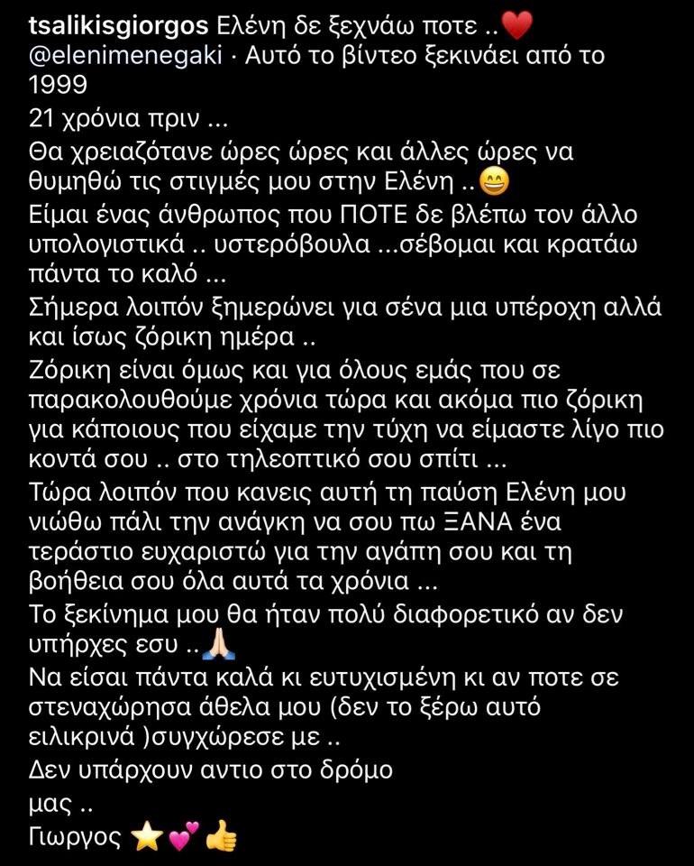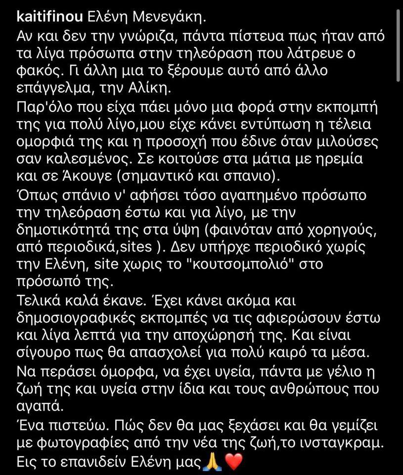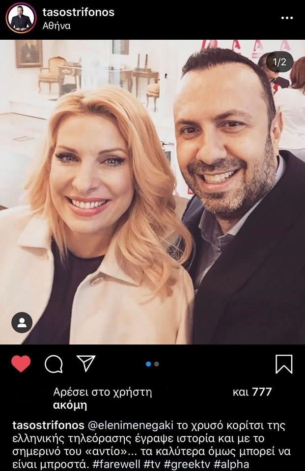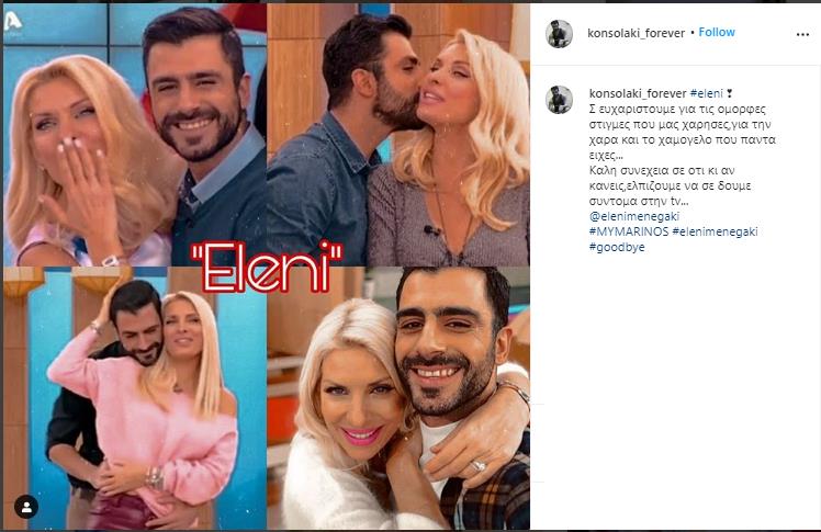 “Όταν σε πρωτοσυνάντησα ήμουν μια ανάλαφρη χαρούμενη κοπέλα😉❤έζησα κοντά σου 25 υπέροχα χρόνια..Μεγάλωσα έμαθα σοβαρεύτηκα😉😉έγινα μαμά…Δάκρυσα Γέλασα Πόνεσα ..τα πάντα..κ σήμερα ..έπρεπε να πούμε Αντίο❤@elenimenegaki ήμουν Πολύ Τυχερή που σε γνώρισα. Σε ευχαριστώ!!!❤❤❤❤”, έγραψε η Ελένη Γελαλή στο μήνυμά της, δημοσιεύοντας δυο φωτογραφίες, η μία από την τελευταία εκπομπή και η άλλη από το ξεκίνημά τους.