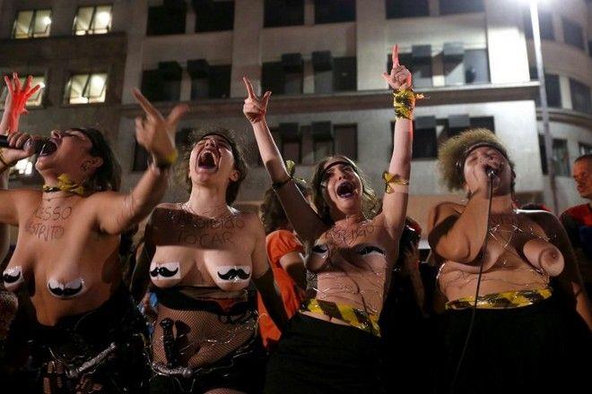 Οι διαδηλώτριες πλημμύρισαν τους δρόμους της πρωτεύουσας, Σάο Πάολο, και του Ρίο ντε Τζανέιρο πρόταξαν τα στήθη τους, κρατώντας πανό με συνθήματα για να αποδοθεί δικαιοσύνη και φώναζαν: "Ολες αιμορραγούμε" και "Δεν ήταν λάθος του θύματος".