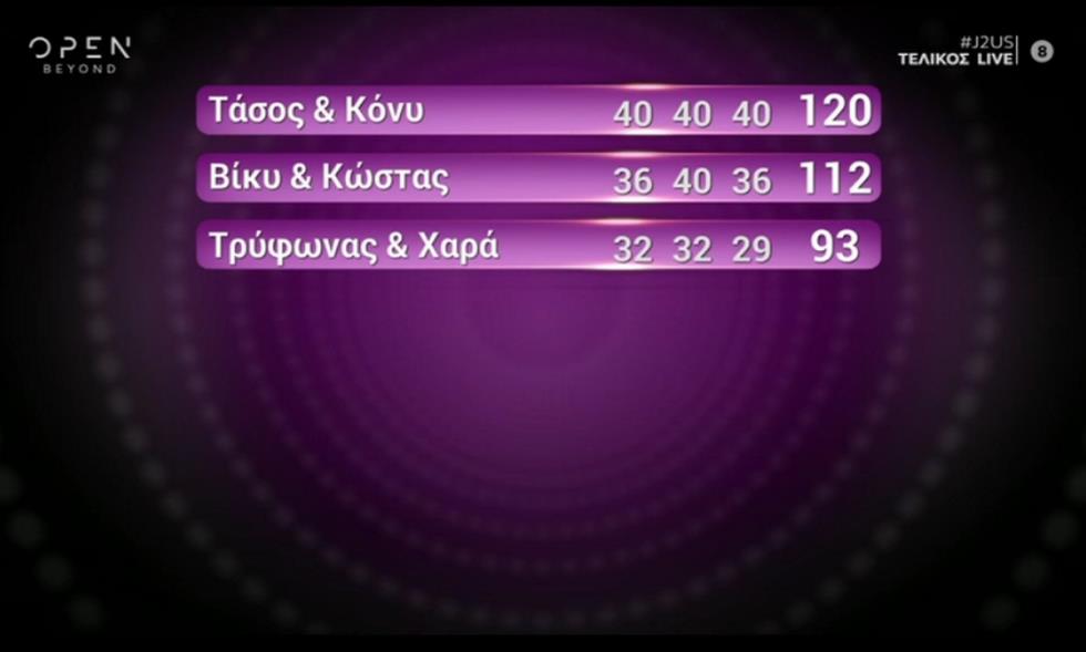 Την τρίτη θέση πήραν ο Τρύφωνας Σαμαράς με τη Χαρά Βέρρα. Τη δεύτερη θέση πήραν οι Βίκυ Χατζηβασιλείου – Κώστας Καραφώτης και μεγάλοι νικητές του J2US αναδείχθηκαν οι Τάσος Ξιαρχός και Κόνι Μεταξά.