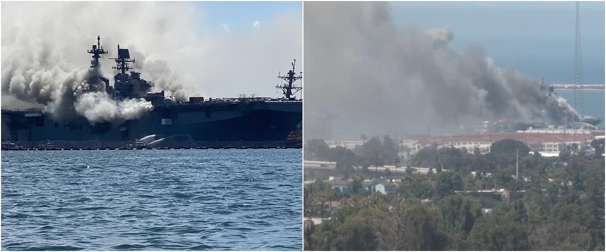 More views of the #fire burning now on board US #Navy amphibious ship USS #BONHOMME RICHARD LHD6 at 32nd Street Naval Station in San Diego. Reports so far indicate 3 sailors, 1 SDFD fireman injured. At the moment the fire seems to be growing pic.twitter.com/icPblRJOEV