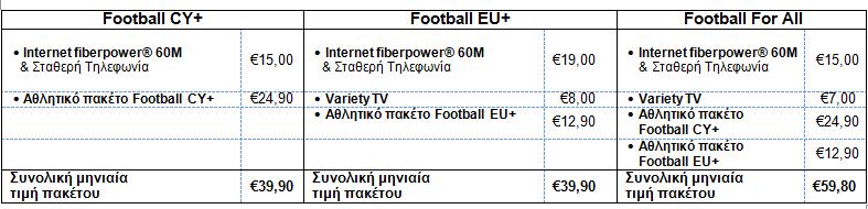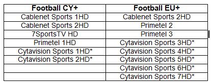 Οι συνολικές μηνιαίες τιμές των πακέτων προϋποθέτουν 24μηνο συμβόλαιο και ισχύουν για όλη τη διάρκεια του 24μηνου συμβολαίου. Χωρίς 24μηνο συμβόλαιο οι τιμές διαμορφώνονται στα €54,80 για το Football CY+, €51,70 για το Football EU+ και €76,60 για το Football For All.