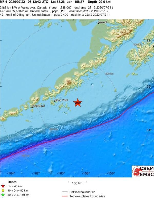 Σεισμική δόνηση μεγέθους 7,6 βαθμών της κλίμακας Ρίχτερ σημειώθηκε στην Αλάσκα σύμφωνα με το Ευρωμεσογειακό Σεισμολογικό Κέντρο (EMSC).