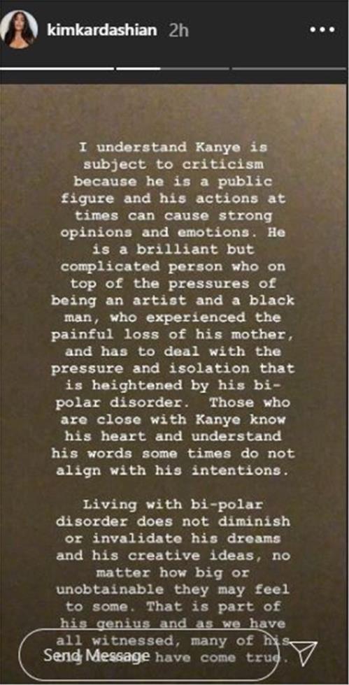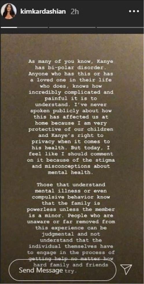 «Όπως πολλοί από εσάς γνωρίζετε, ο Kanye πάσχει από διπολική διαταραχή. Οποιοσδήποτε πάσχει ή έχει κάποιον στο περιβάλλον του, γνωρίζει πόσο πολύπλοκο και επίπονο είναι να το κατανοήσεις. Δεν έχω μιλήσει ποτέ δημόσια σχετικά με το πόσο μας έχει επηρεάσει αυτό στο σπίτι, επειδή είμαι πολύ προστατευτική με τα παιδιά μας και το απόρρητο της υγείας του Kanye.